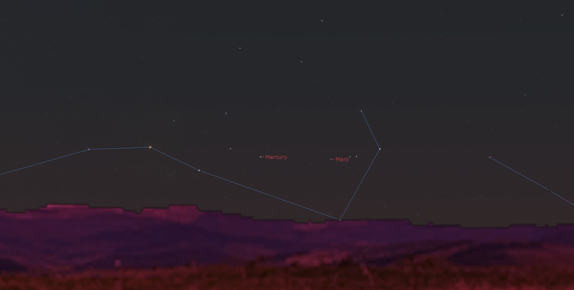 12.- Mercurio se ubica a solo 1.3° al sur de Marte bajos en el cielo del sureste después del atardecer, entre las “pinzas” de Escorpión. Esta es una observación difícil para observadores en nuestro hemisferio, pero los suertudos del sur verán esta conjunción mas alta en su horizonte por mas tiempo. Binoculares nos permitirán extraer mejor observación de estos objetos del resplandor del crepúsculo. Mercurio brilla a magnitud +1.1, mas que el rojizo planeta Marte a +1.5. Al telescopio, Mercurio nos muestra una fase creciente iluminada un 20% de su área total y 9” de diámetro. Marte esta menos de la mitad de diámetro y no ofrece nada de detalle a esta distancia.