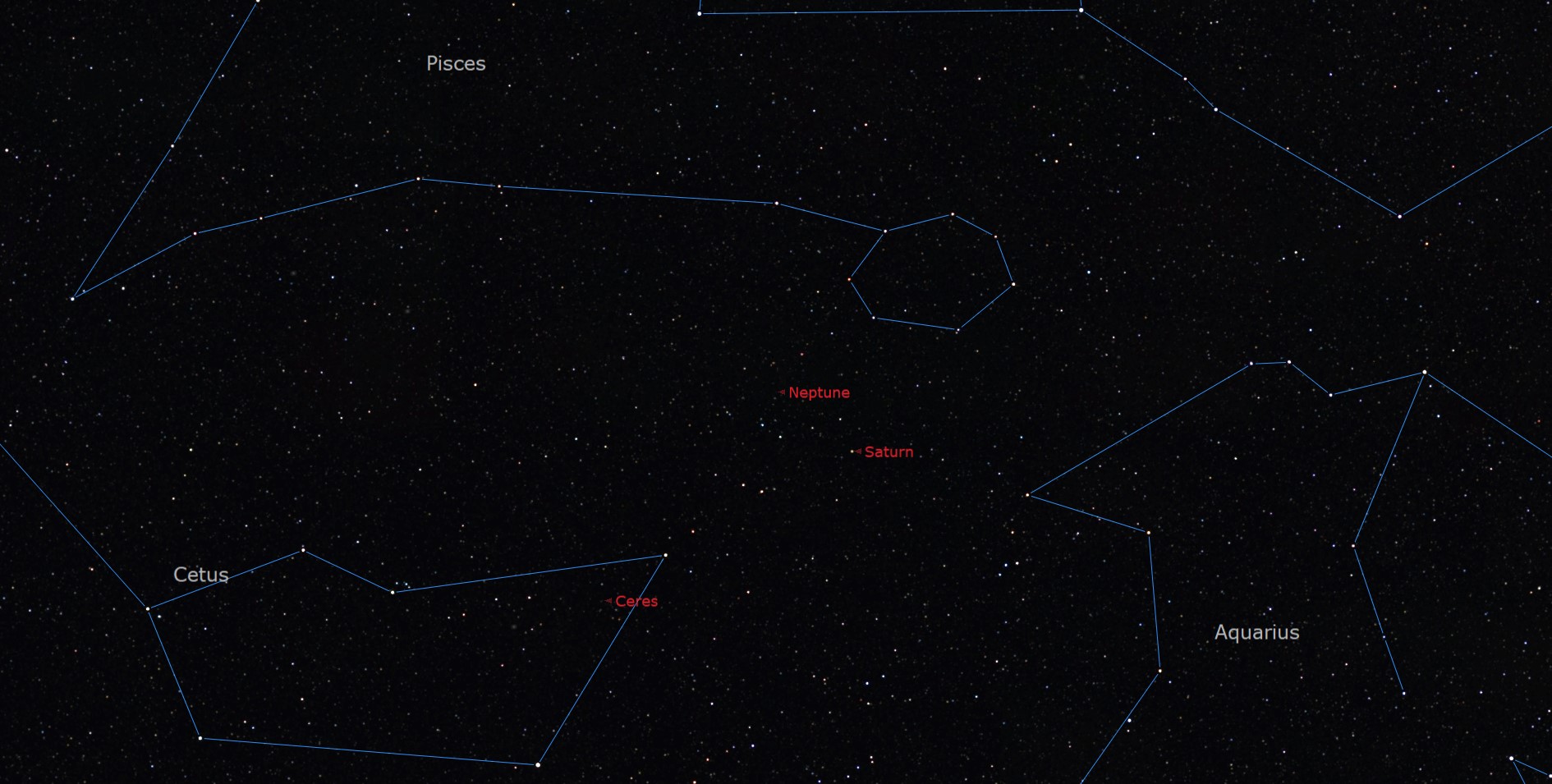 Neptuno esta observable también toda la noche y su brillo también va decreciendo. De una magnitud de +7.8 a +7.9. Para poderlo ver, igual que a Urano, necesitamos un telescopio