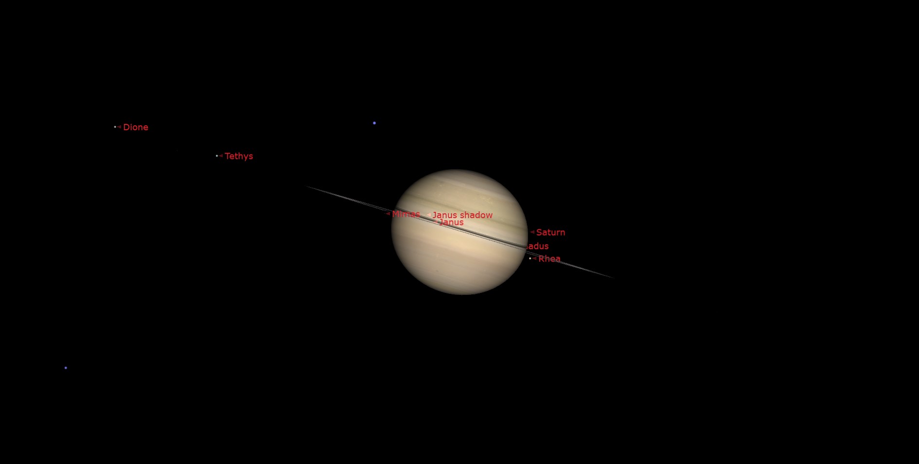 1.- Busque a Saturno en el sureste siguiendo a una Luna gibosa a solo unos 5°. Los anillos del planeta se inclinan a menos de un grado de nuestra perspectiva presentando una rara vista al telescopio junto con varias de sus lunas.