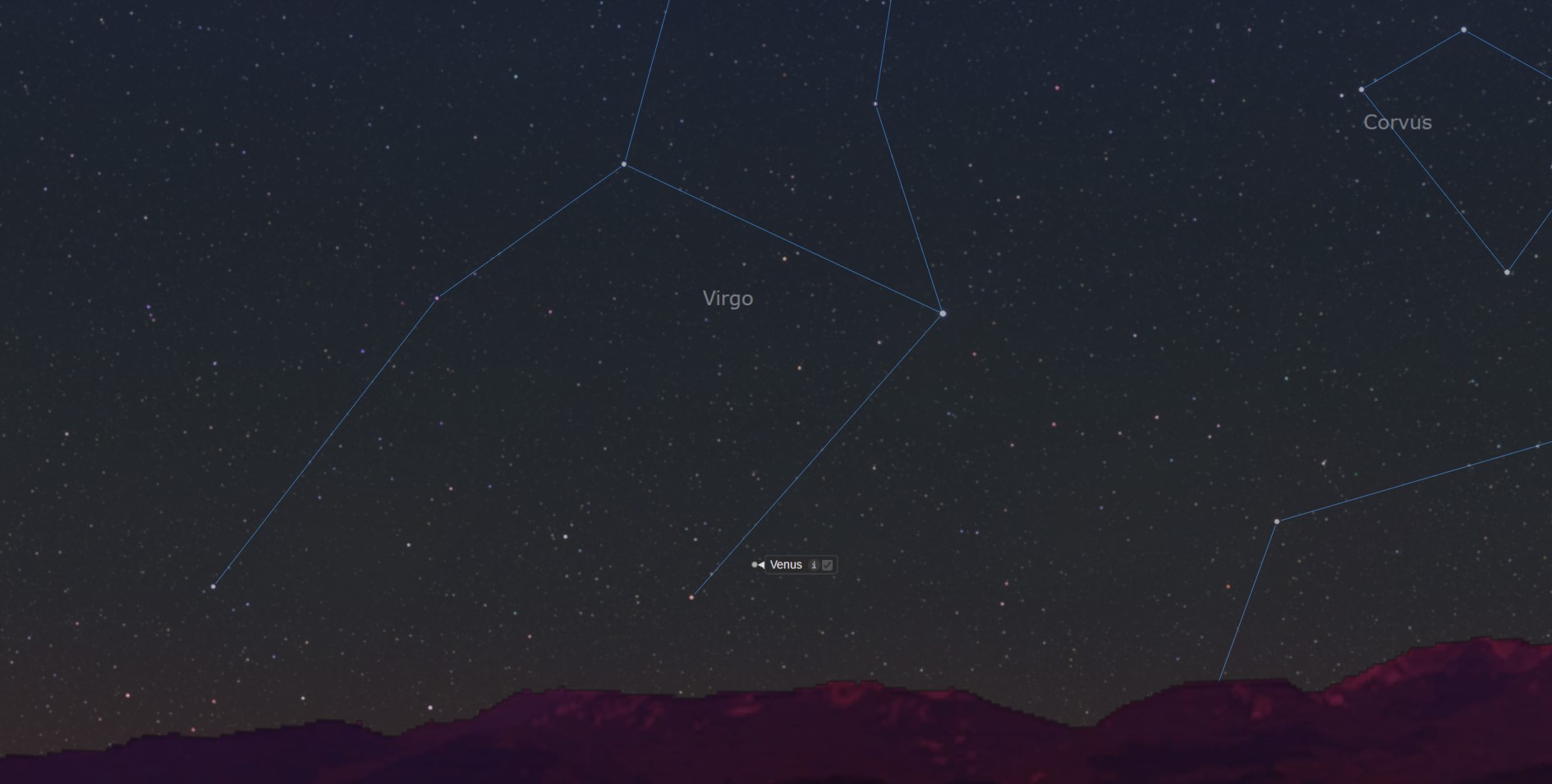 17.- La delgada Luna decreciente se ubica a poca mas de un grado al sur de Spica antes del amanecer y Venus se puede ver a unos 20° abajo hacia el este mas cercano al horizonte.