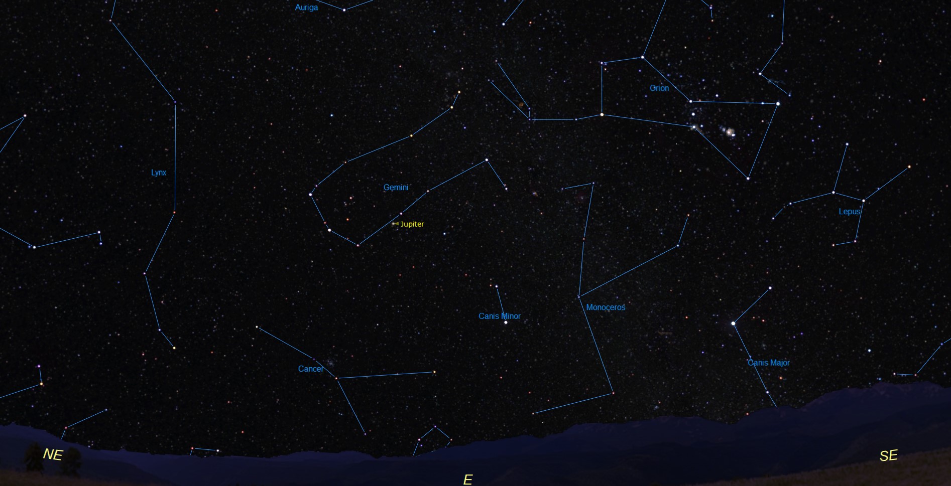 9-10.- Júpiter en oposición. Sale por el este cuando el Sol se pone por en  oeste.  El planeta gigante se ubica a una distancia de 4.23 UAs (Unidades Astronómicas) o sea 632.8 millones de kilómetros y brilla a una magnitud de -2.7, más brillante que cualquier otra estrella en el cielo nocturno…excepto la Luna y Venus. Su disco muestra un diámetro aparente de 47”. Actualmente flota en la constelación de Géminis Jupe se mantiene bien posicionado por los siguientes meses mostrando detalle de su sistema de bandas y sus 4 lunas mayores al telescopio.