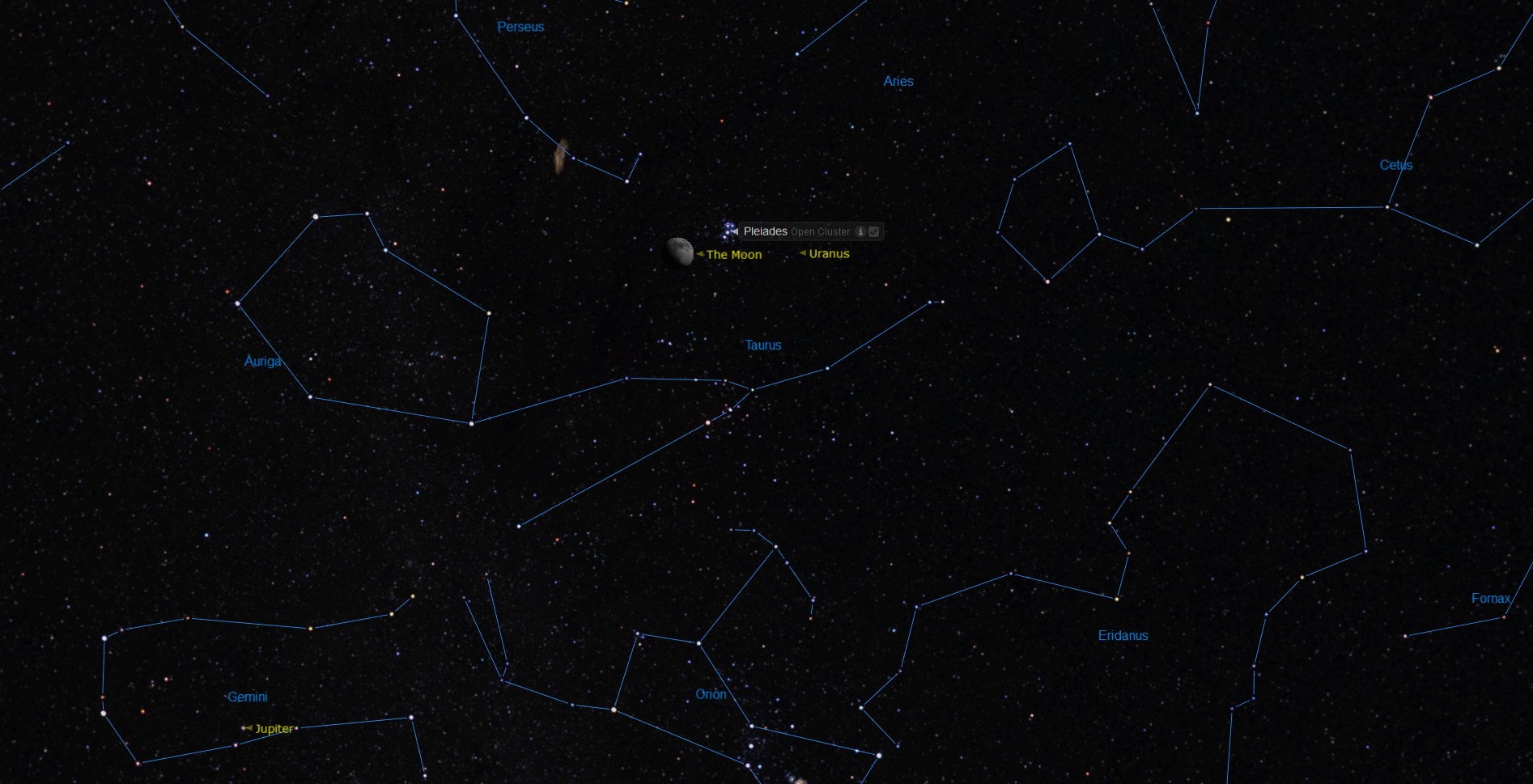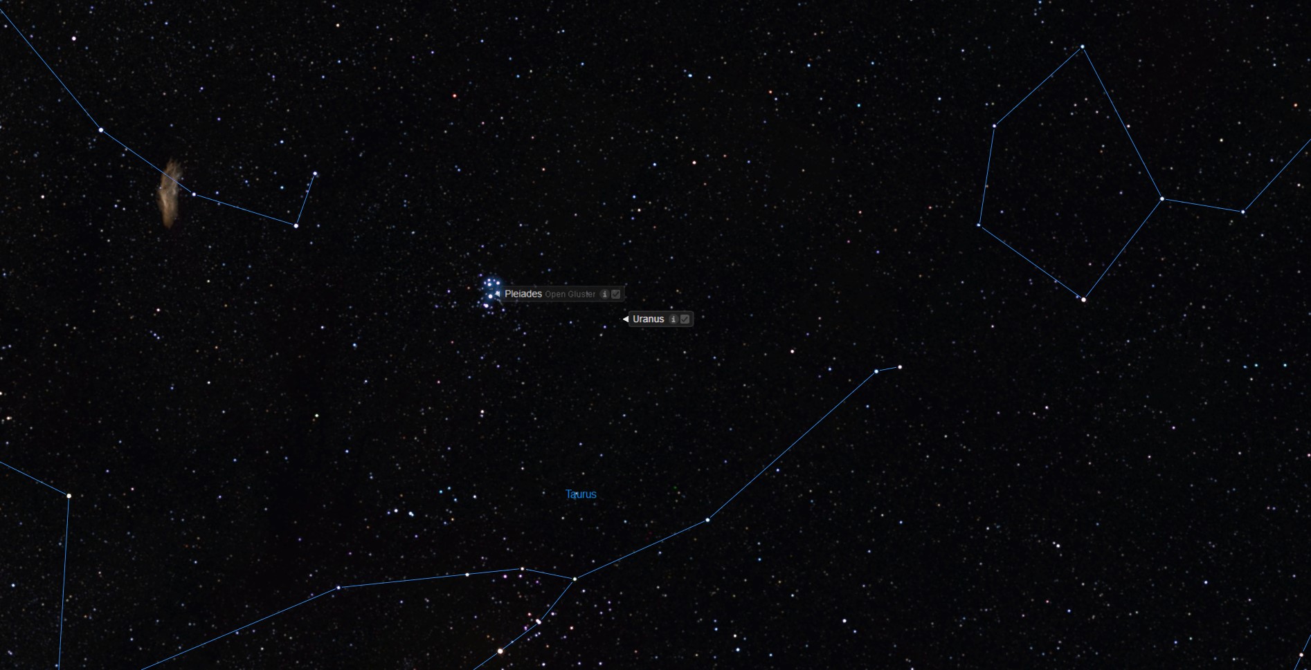 Ubicación del planeta Urano. 5° al oeste de las Pléyades.